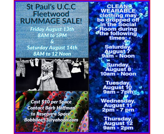St. Paul’s UCC Church at 5 W. Arch St. in Fleetwood is having an Rummage Sale in their social room, Friday, Aug.13, 2021 starting at 8 a.m. – 5 p.m. & Saturday, Aug. 14, 8 a.m.-12 p.m. Parking available on church parking lot or Municipal Parking Lot on Arch St. Concession Stand available both days with a Yard Sale also on Sat.
