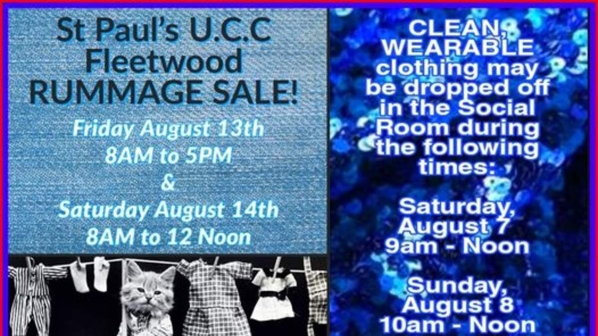 St. Paul’s UCC Church at 5 W. Arch St. in Fleetwood is having an Rummage Sale in their social room, Friday, Aug.13, 2021 starting at 8 a.m. – 5 p.m. & Saturday, Aug. 14, 8 a.m.-12 p.m. Parking available on church parking lot or Municipal Parking Lot on Arch St. Concession Stand available both days with a Yard Sale also on Sat.