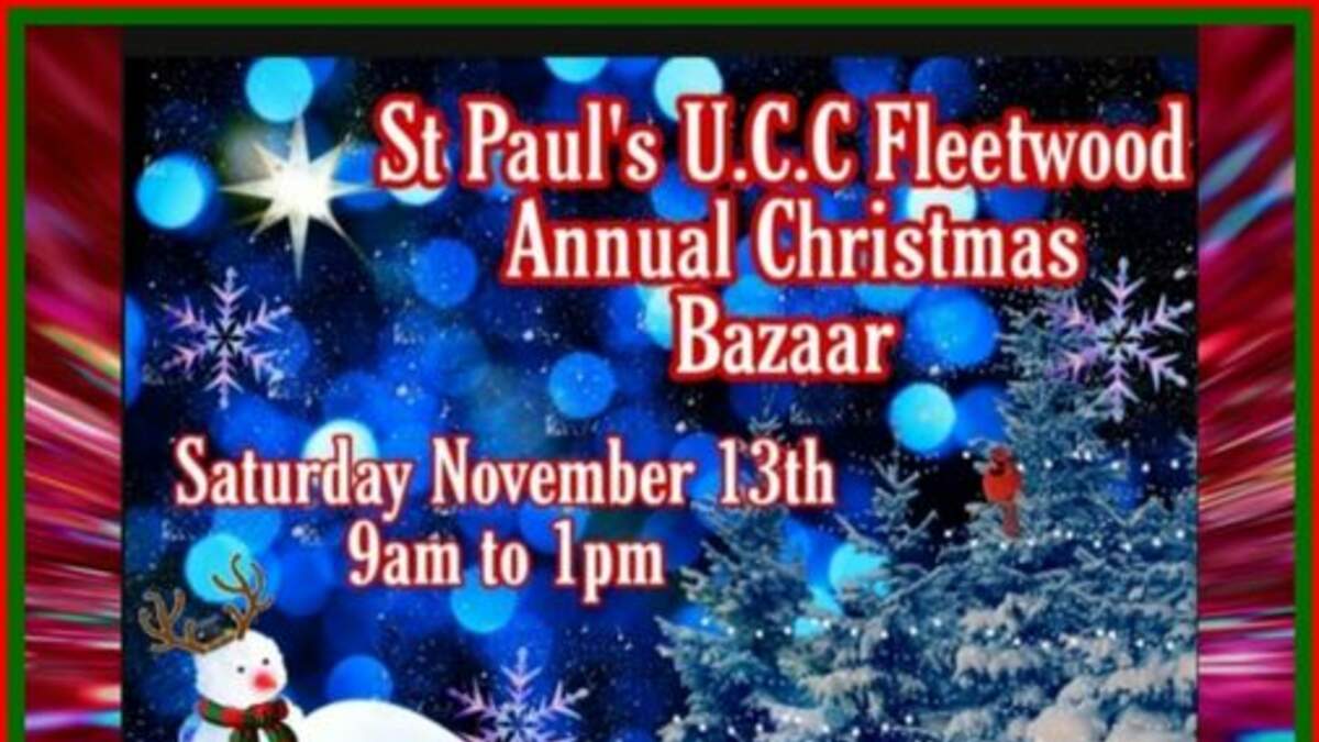 St. Paul’s U.C.C. Church (5 W. Arch St. Fleetwood) is having a Christmas Bazaar, Saturday, November 13, 2021 from 9:00 a.m.-1:00 p.m. There will be vendors and crafters showing their products such as: Avon, Tastefully Simple, Scentsy, Tupperware, Longaberger Baskets, 31 & Gemstone Jewelry, crafters, a book & toy room, and a white elephant sale. In the social room, there will be a silent auction & homemade food (soup, BBQ, hot dogs & baked goods) for sale.