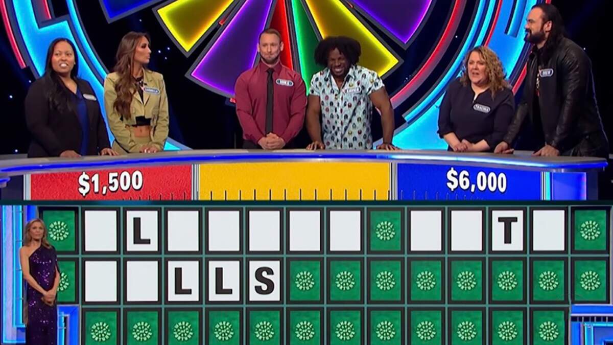 This week, Wheel is running a special WWE tournament that sees three regular players teaming up with three pro wrestlers. Towards the end of the show, there was a puzzle in the category "Fun and Games" and the board showed "_ L _ _ _ _ _ _ _ T _ _ _ LLS." A contestant named Tracina, along with her partner, two-time WWE champ Drew McIntyre, guessed "Playing With Balls."